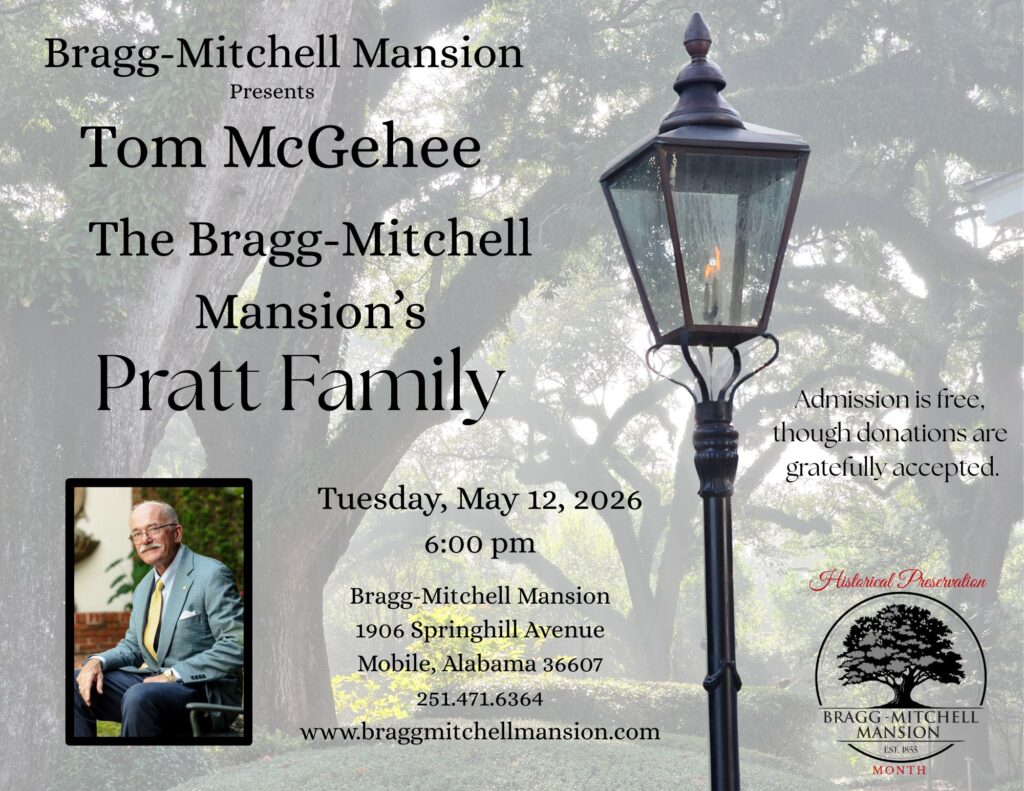 Join the Bragg-Mitchell Mansion for an evening lecture on The Pratt Family presented by Tom McGehee, Tuesday, May 12, 2026, 6:00pm