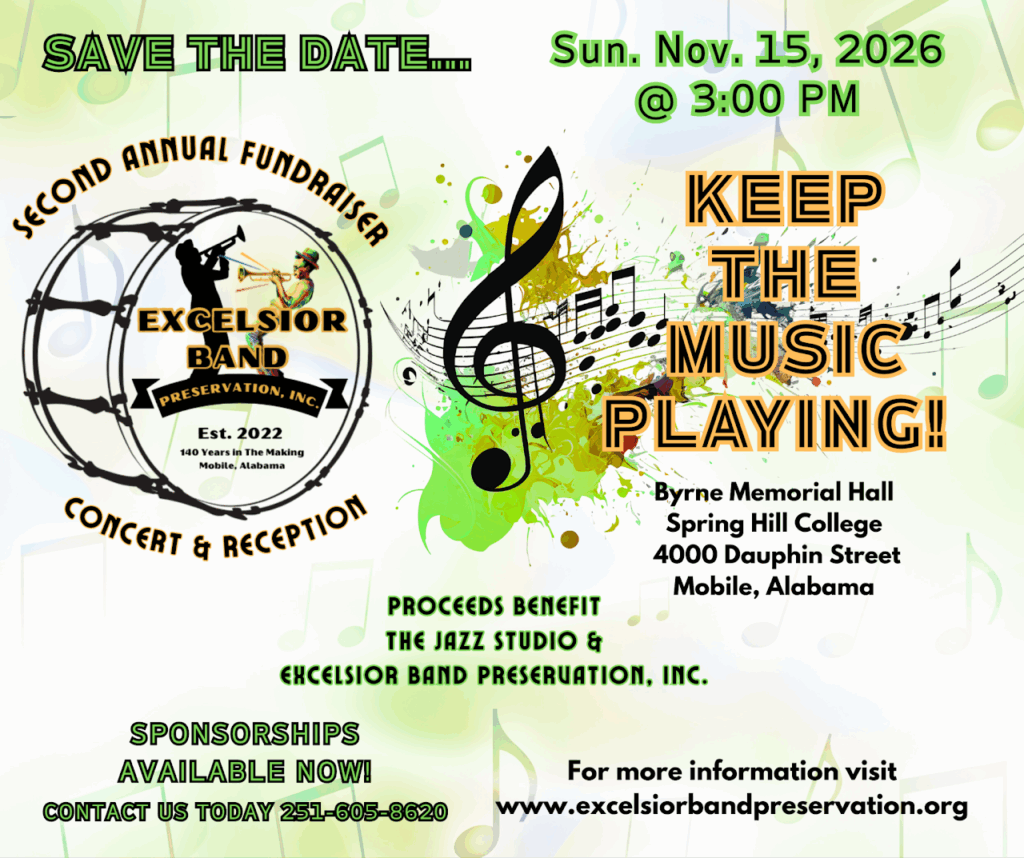 Excitement is in the air! Get ready to be part of something extraordinary at the Excelsior Band Preservation’s inaugural fundraising event. It’s an event like no other, and we want you to be there! The Excelsior Band will celebrate 142 years delighting Mobile and the central gulf coast. The Jazz Studio, in its 11th year, will also perform.