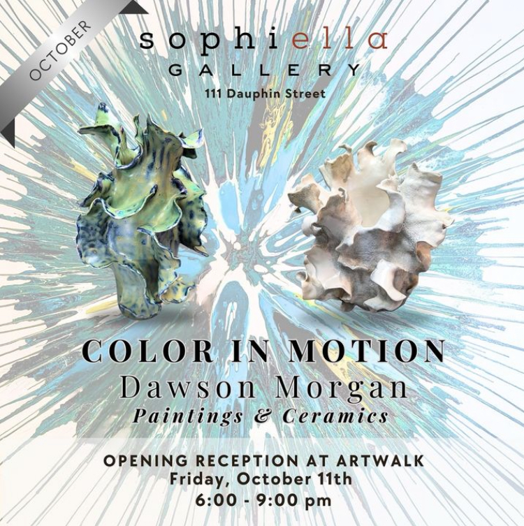 October will usher in a new and innovative show by Dawson Morgan. Known for her signature ceramic creations, Dawson has moved color to canvas in this inaugural presentation-featuring 2D and 3D work!