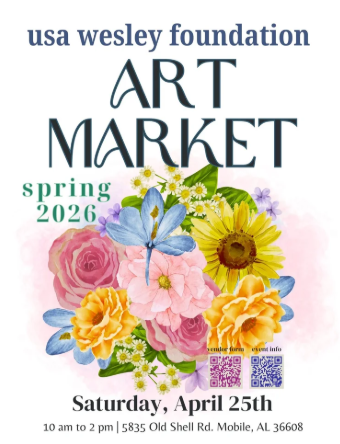 The Wesley Foundation is pleased to be hosting the 3rd Annual Community Art Market at USA Wesley Foundation, a United Methodist Church college ministry, located directly across from the Mitchell Center at the University of South Alabama! The Spring Community Art Market will be a time of fun and fellowship, celebrating local artists and makers from all corners of the place we call home. Join them for a family-friendly event, complete with arts, crafts and stories, live local music, bubbles, face painting and much more! They will also be selling delicious Boston Butts and Wesley Merch to help raise funds for their ministry and missions here at South Wesley. South Wesley welcomes students of all backgrounds to join in Outreach, Fellowship, Worship, Discipleship and Missions. They aim to create a safe environment for students to connect, serve and grow.