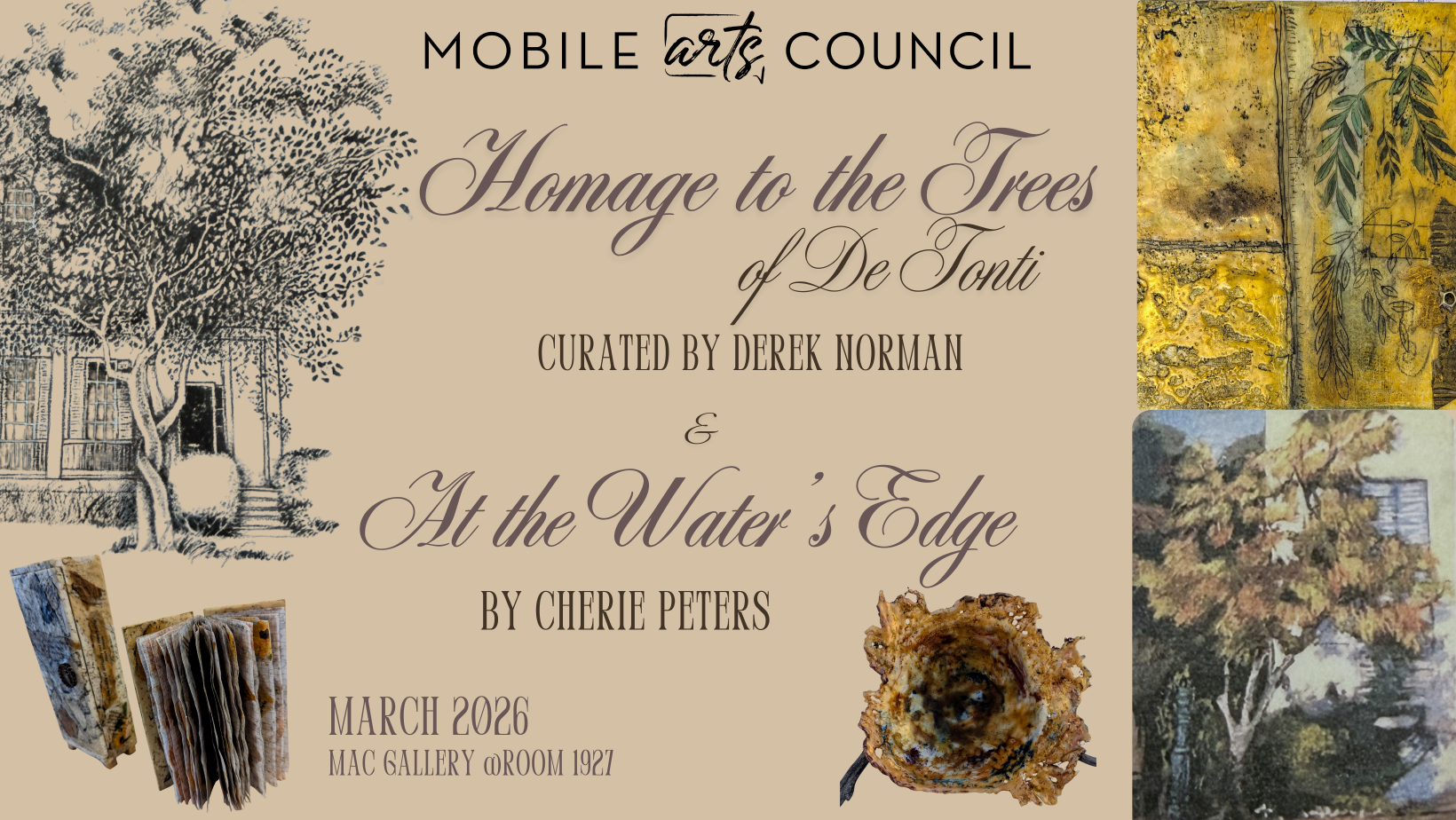 As hints of spring begin to appear, the Mobile Arts Council (MAC) joyfully sharestwo exhibits reminding us of nature’s growth. Cherie Peters’ exhibit, At the Water’s Edge, evokes an earthy aesthetic with her mixed-mediacompositions integrating found objects onto wood, paper, or plexiglass. Using ancient encaustictechniques, she creates modern textured compositions. Cherie showcases her work in…
