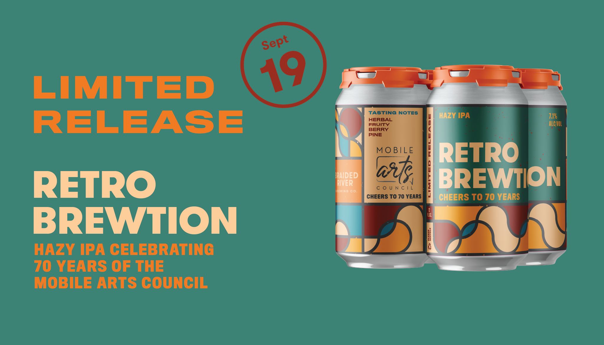Join us in the taproom on Friday, September 19th, for the release of our new hazy IPA, Retro-Brewtion! Braided River Brewing Company brewed this beer to celebrate 70 years of the Mobile Arts Council enriching the quality of life in Mobile. This hazy IPA is an exploration of the art of beer, using new hops…
