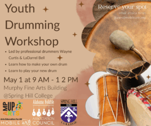 Mobile Arts Council is proud to announce a drumming workshop in celebration of International Drum Month! This free member workshop is open to all ages and will be led by professional drummers, LaDarrel Bell of Excelsior Band, and Wayne Curtis of Mobile Alabama Africatown Drummers. Attendees will learn a bit of local history behind drumming…