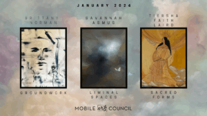 The Mobile Arts Council is proud to announce its upcoming exhibitions for January 2026, featuring three artists whose works exemplify the beauty of nature and human figures. Groundwork is inspired by nature, urban environments, and the complexities of human experience, and invites viewers to engage through personal interpretation and emotional connection.Light, color, and motion interact…