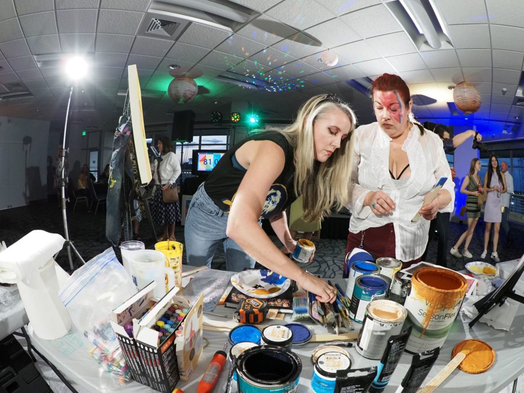 The 10th Annual Throwdown was one of our toughest art competitions yet! On Friday, September 16th, artists John Halliday, Devontae Knight, Mayssam Iskandar, Christopher Murray, and Elizabeth Brooks had 90 minutes to create an original piece of art while utilizing a surprise item. Inspired by our event venue - the USS Battleship Memorial Park's Aircraft Pavilion - this year’s mystery box item was a wooden airplane.