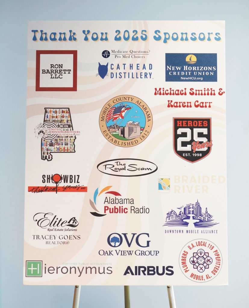 Thank you to our 2025 event sponsors: Mobile County Commission, Heroes Sports Bar & Grill, The Royal Scam, United Johnson Brothers, New Horizons Credit Union, Downtown Mobile Alliance, Cathead Distillery, Braided River Brewing Co., 119 Plumbers & Pipefitters, Michael Smith & Karen Carr, Tracey Goens-Elite Real Estate, Airbus, Alabama Public Radio, Showbiz Theatrical Services, Oak View Group, Pro Med Choices, Hieronymus CPA's and Ron Barrett LLC.